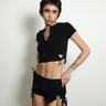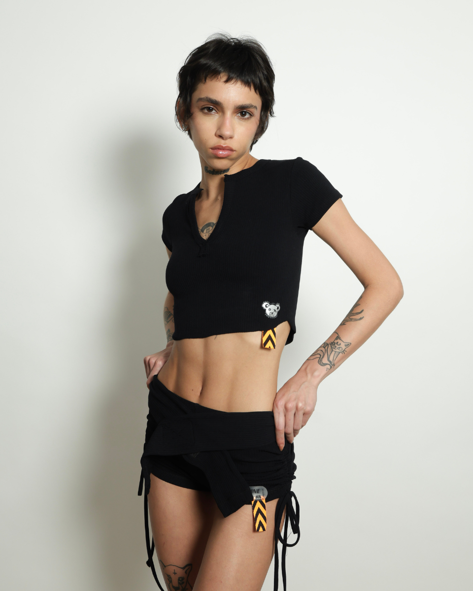 Seu design diferenciado inclui camadas sobrepostas, amarrações laterais ajustáveis e detalhes têxteis exclusivos que reforçam a estética Glowshine — contemporânea, ousada e influenciada pela energia da cultura street e do universo fitness.