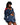 A modelagem é cropped e oversized, com um design em camadas que cria um visual volumoso e moderno. O capuz, com forro em um vibrante tom de vermelho, contrasta com o exterior da peça. A jaqueta possui grandes bolsos utilitários frontais e nas mangas, além de fechos de zíper e detalhes em argolas prateadas. As alças que pendem da barra da jaqueta são um diferencial que adicionam ainda mais personalidade.