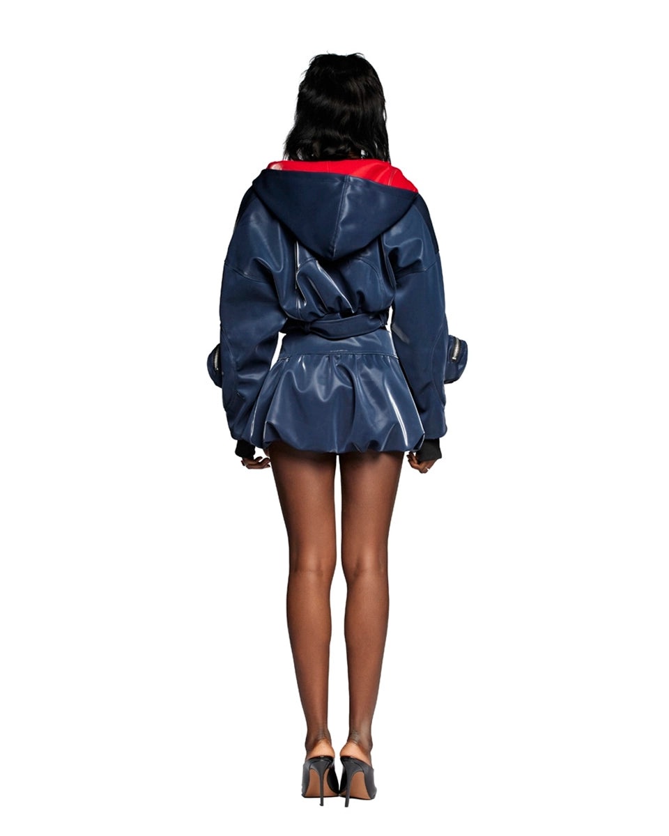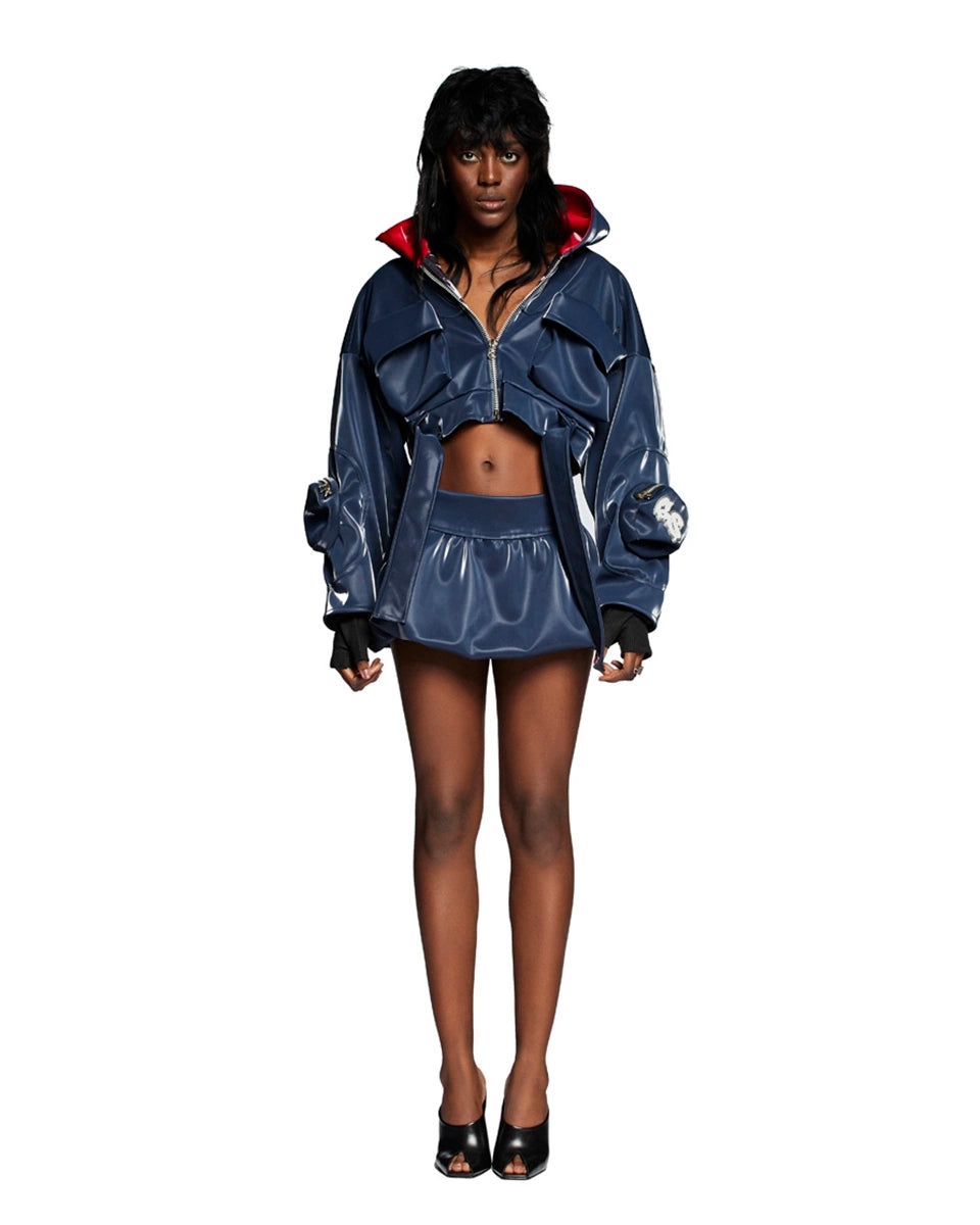 A jaqueta Queen City é uma peça que redefine o estilo utilitário com um toque futurista e ousado. Confeccionada Vinil, ela se destaca pelo acabamento em com um brilho intenso na cor azul-marinho.